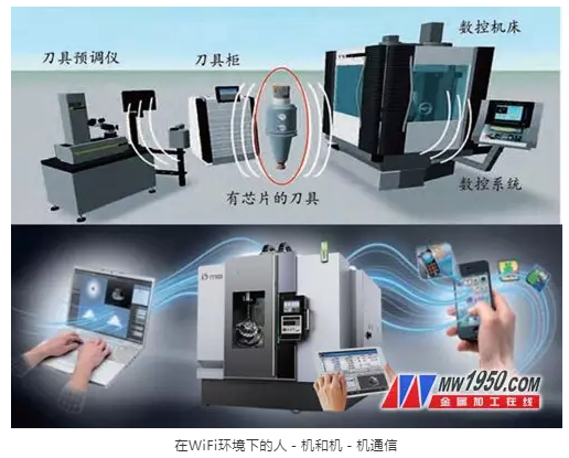 從圖中可見,不僅人機的交互方式從控制面板延伸到移動終端,設(shè)備和工具之間也可以進行物與物的通信。機床的加工精度和效率在很大程度上取決于刀具的狀態(tài),如果在刀具或刀柄上嵌入芯片,就成為智能刀具。芯片不僅可以記錄在刀具預調(diào)儀上進行調(diào)整時的數(shù)據(jù),還可以記錄刀具在機床進行了多長的切削時間,還有多少剩余壽命,可以加工幾個零件等都可以讓操作者和有關(guān)部門了如指掌,減少停機和更換刀具的時間。智能刀具及其管理的概念如上圖所示。