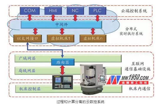 智能工廠的數(shù)控機床和機器人等智能裝備的未來發(fā)展重點已經(jīng)不在硬件,感知外部環(huán)境和工況變化需要更加強大的計算能力、通信帶寬和速度,才能進行實時控制,形成真正的信息物理融合系統(tǒng)。它的特點是將設(shè)備的控制分為計算和過程兩部分,把運動控制保留在本地,而將計算移到云端,在云端“克隆”相應(yīng)的虛擬設(shè)備,在云端進行虛擬制造,如圖所示。