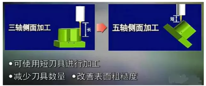 與三軸聯(lián)動的數(shù)控加工相比,從工藝和編程的角度來看,對復雜曲面采用五軸數(shù)控加工有以下優(yōu)點:
