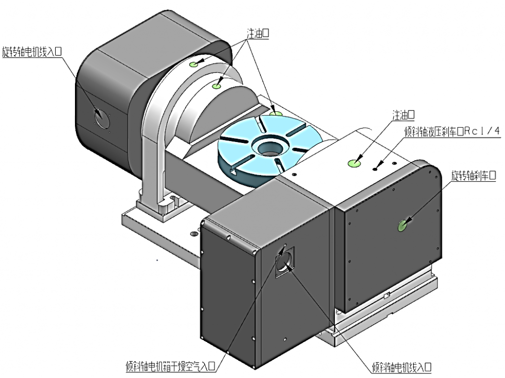 打開轉(zhuǎn)臺附帶的說明書在目錄中找到【潤滑】一項,按照其中注明的放油口和進油口操作,轉(zhuǎn)臺上也有相應的標識,以下是說明書中標識的范例: