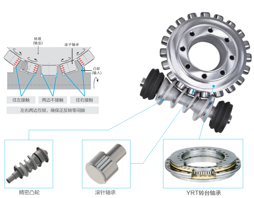 滾子與凸輪接觸面大 → 剛性比蝸輪蝸桿結構轉臺更高